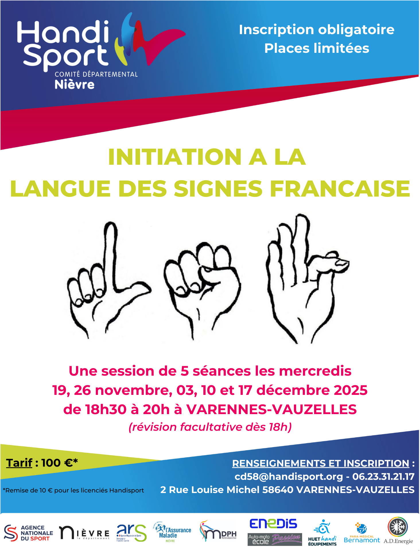 Le CD HANDISPORT 58 vous propose une nouvelle session d’initiation à la LANGUE DES SIGNES (LSF).